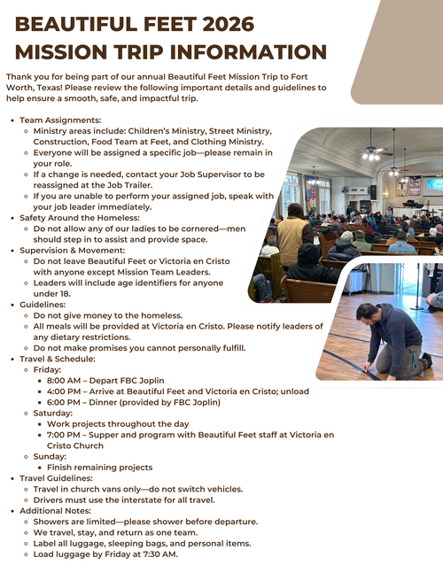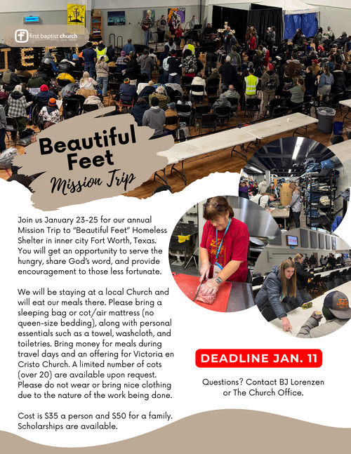 Our 2026 Beautiful Feet Mission Trip to Fort Worth, TX, will be January 23-25. The cost is $35 per person, or $50 per family.